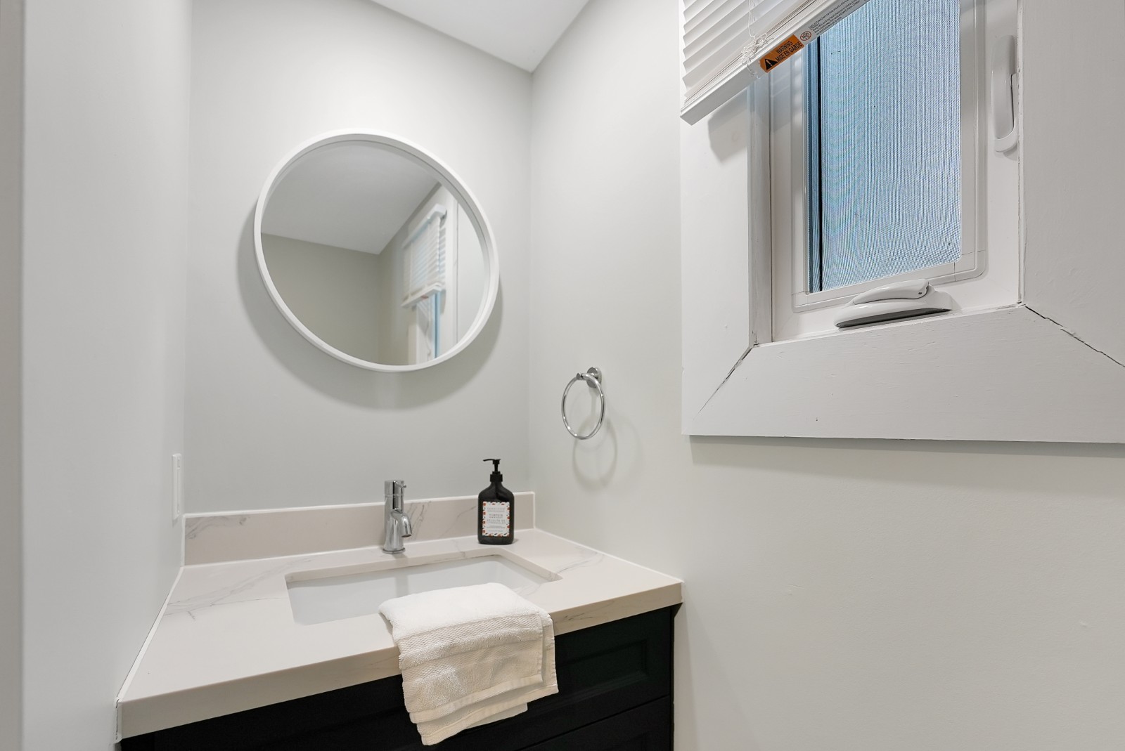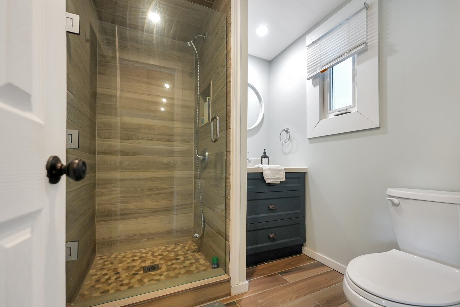 The main level boasts a spacious open-concept layout, featuring a custom kitchen adorned with a stunning live edge countertop and a sprawling pantry, ideal for culinary enthusiasts and avid entertainers. The adjoining living area is perfect for relaxation and gatherings, providing a seamless transition to the large