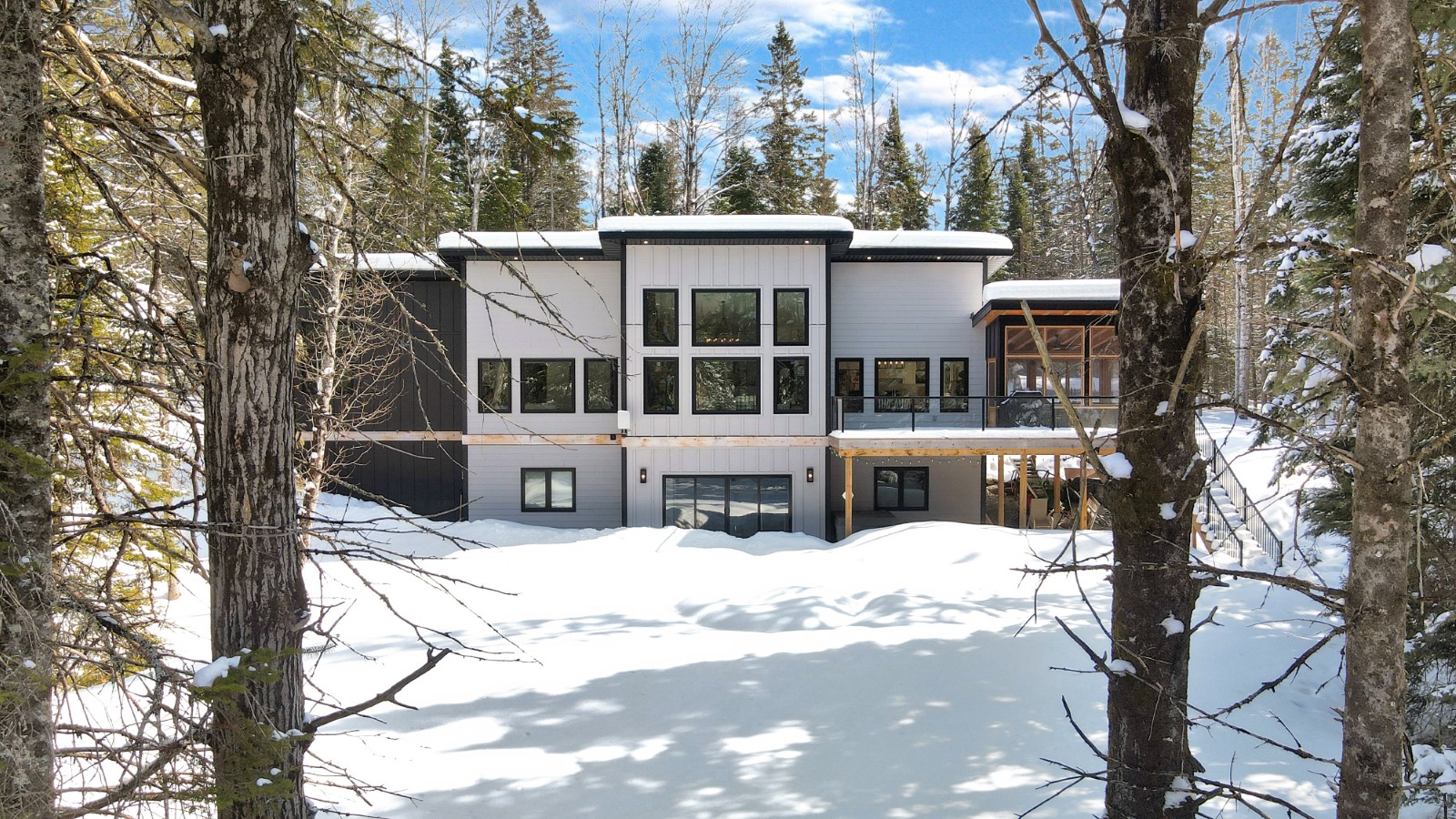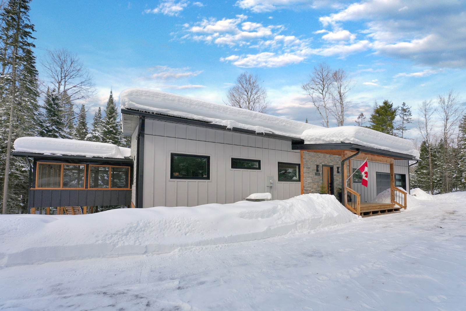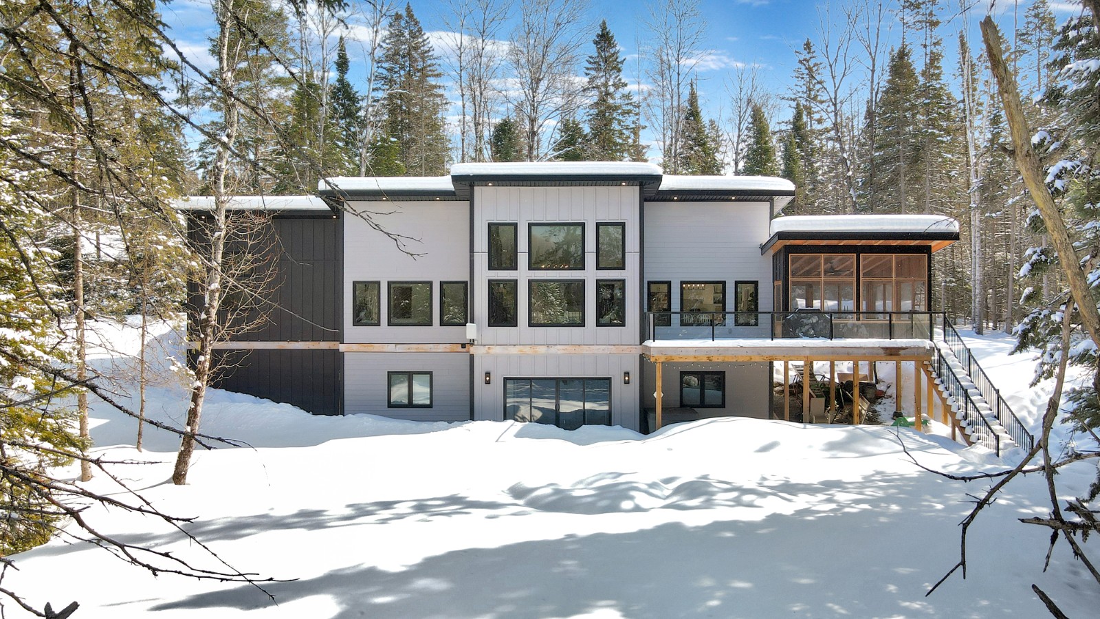 The main floor is filled with natural light, anchored by expansive windows and an open-concept living and dining area designed for gathering. The contemporary kitchen features quartz countertops, stainless steel appliances, and a dedicated coffee bar for easy mornings. Just off the main living space, the impressive 16x16 three-season Haliburton Room extends your living area—ideal for relaxed dinners, entertaining friends, or enjoying peaceful views of the surrounding forest. Three spacious bedrooms and two well-appointed bathrooms complete this level.
