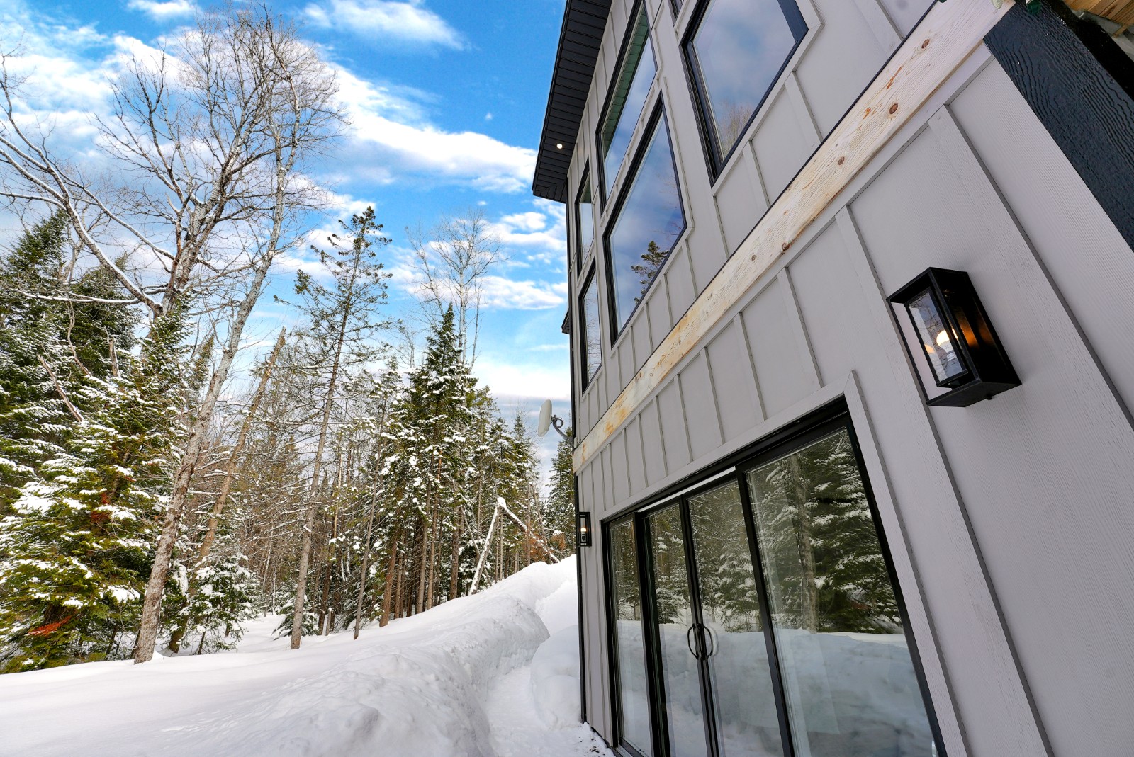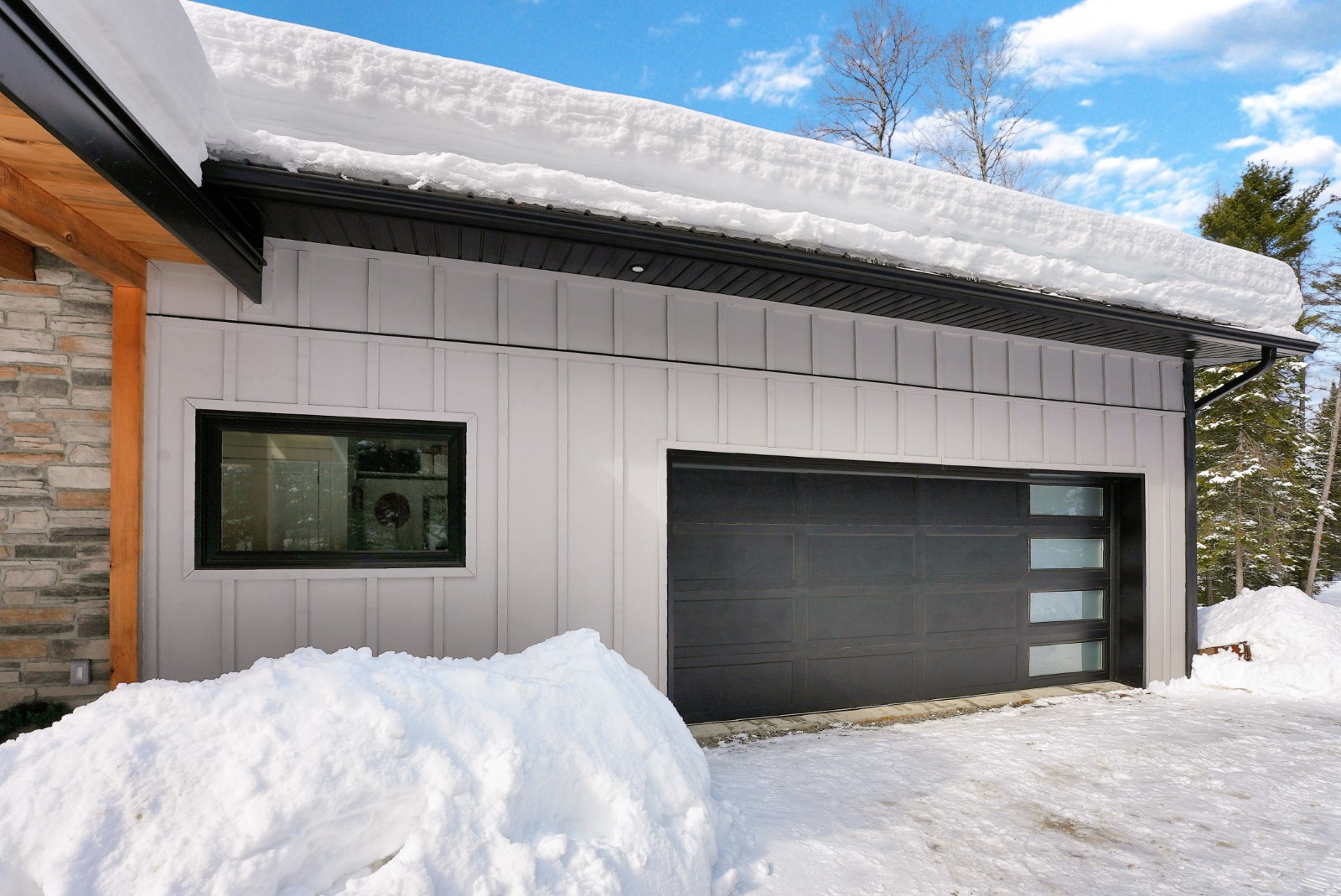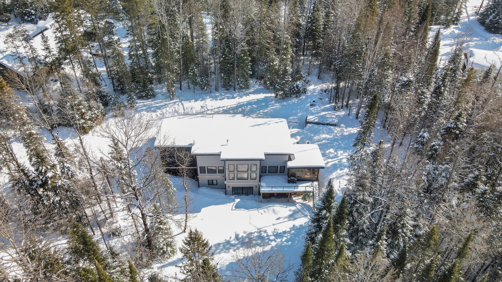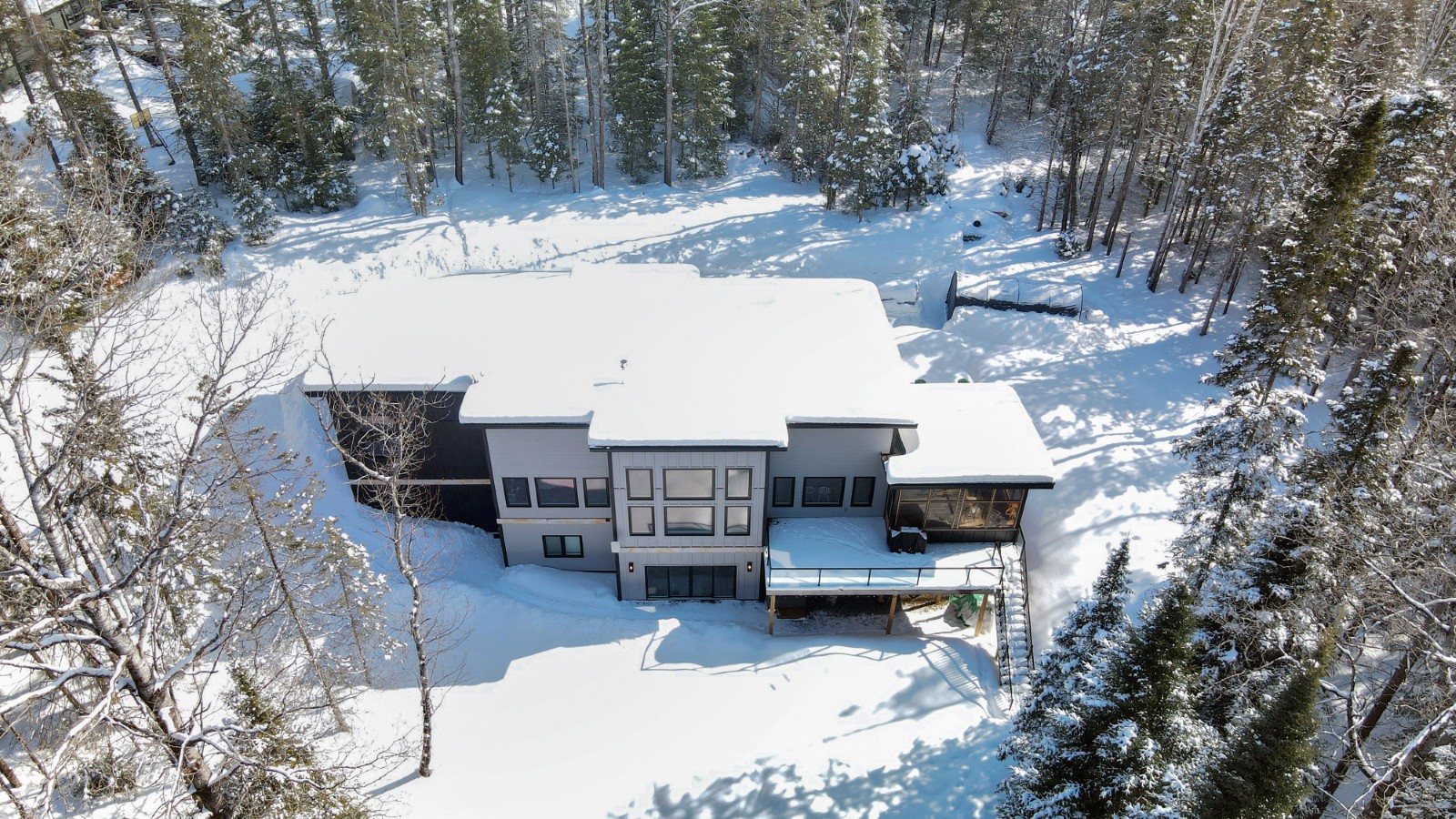 The main floor is filled with natural light, anchored by expansive windows and an open-concept living and dining area designed for gathering. The contemporary kitchen features quartz countertops, stainless steel appliances, and a dedicated coffee bar for easy mornings. Just off the main living space, the impressive 16x16 three-season Haliburton Room extends your living area—ideal for relaxed dinners, entertaining friends, or enjoying peaceful views of the surrounding forest. Three spacious bedrooms and two well-appointed bathrooms complete this level.